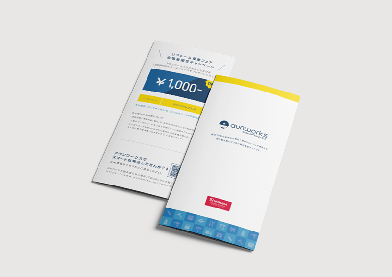 プロ向け建材通販サイト「アウンワークス」様がリフォーム産業フェアに出展した際のパンフレットを制作いたしました。(アニメーションを活かした動画コンテンツも一緒に制作してしております。)